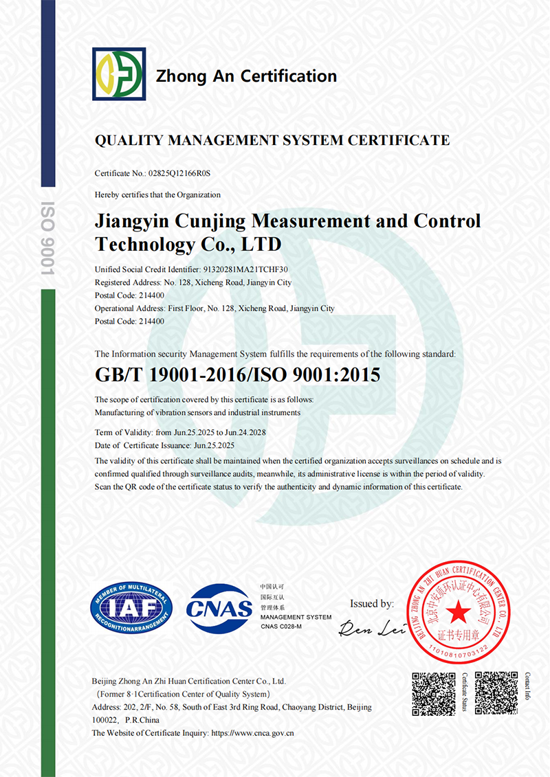 Jiangyin Cunjing Meas&Ctrl tech Co., Ltd. - это высокотехнологическое предприятие, главным образом занимающееся мониторингом и анализом вибрации различных механизмов, разработкой экспертных систем диагностики неисправностей, а также исследованием, разработкой, производством, продажей и обслуживанием промышленных интеллектуальных приборов и систем промышленной автоматизации управления.